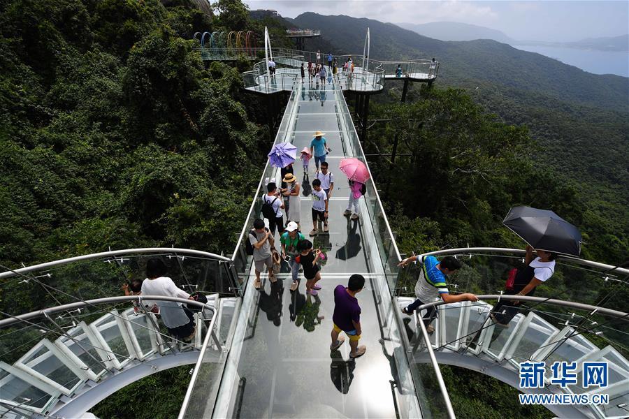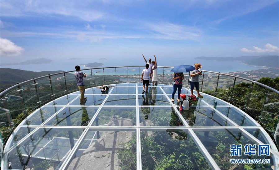 8月31日,游客在玻璃棧道上參觀(guān)游覽。近日,位于海南省三亞市亞龍灣熱帶天堂森林公園的大佛石全海景玻璃棧道開(kāi)始正式營(yíng)業(yè)。凌空而建的玻璃棧道全長(zhǎng)400米,游客可將亞龍灣的美景盡收眼底。新華社記者郭程攝