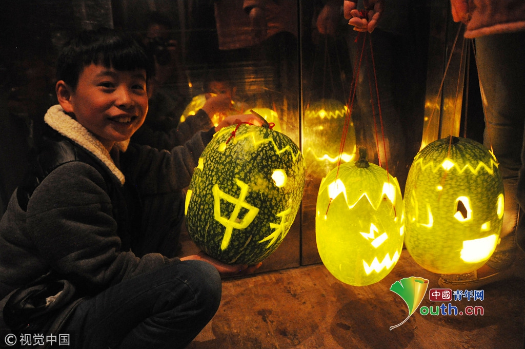 2015年9月27日,貴州省威寧縣海邊街道大洼塘社區(qū),一名孩子在展示手工制作的瓜燈。當(dāng)日,是中國(guó)傳統(tǒng)節(jié)日“中秋節(jié)”,群眾與孩子們一道制作手工瓜燈,歡度中秋佳節(jié)的到來(lái),當(dāng)?shù)赜兄谱鞴蠠魬c中秋的習(xí)俗。