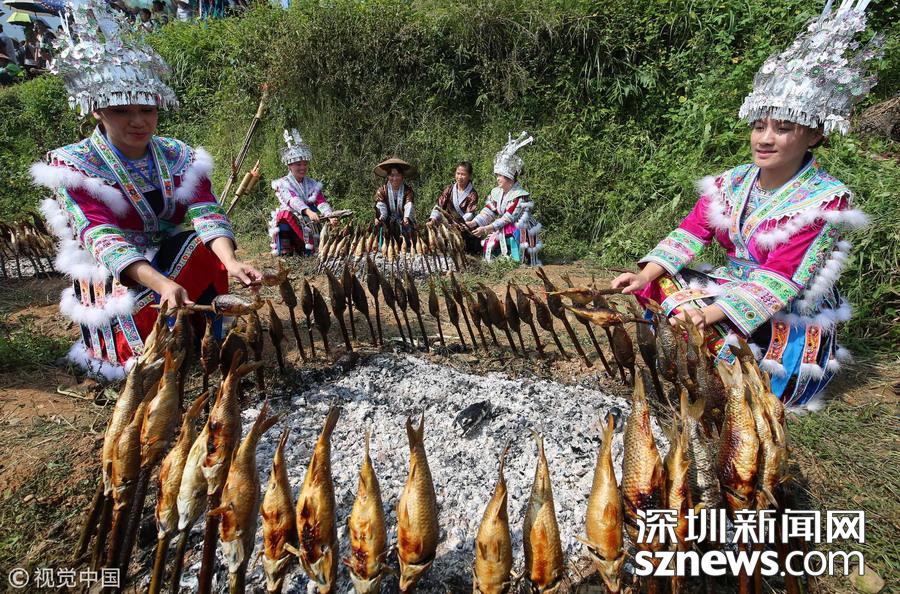 2016年9月17日,貴州省榕江縣平陽(yáng)鄉(xiāng)硐里村七位侗家婦女們正燒魚。每年中秋時(shí)節(jié),當(dāng)?shù)囟弊逋_田放水,捉魚,全寨男女老少,野外生起篝火烤魚,用烤魚、米酒等,祭祀魚神,祈禱魚糧豐收的傳統(tǒng)民俗活動(dòng)。