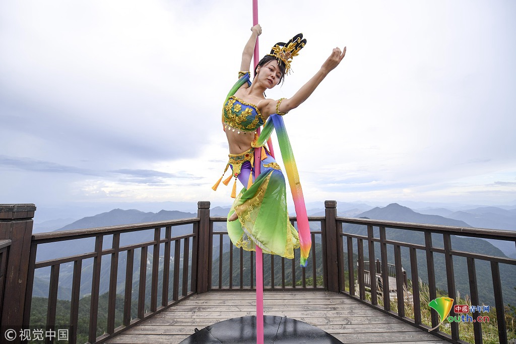 2018年9月20日,中秋節(jié)前夕,位于長(zhǎng)三角第一高峰海拔1929米的浙江龍泉山頂,一場(chǎng)柔美的鋼管舞表演吸引了眾人圍觀。