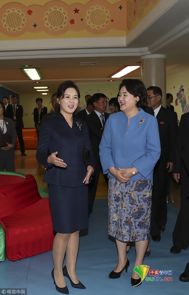 當(dāng)?shù)貢r(shí)間2018年9月18日,朝鮮平壤,韓國總統(tǒng)文在寅夫人金正淑在朝鮮國務(wù)委員會(huì)委員長金正恩夫人李雪主的陪同下參觀平壤金元均音樂大學(xué)。圖片作者:視覺中國