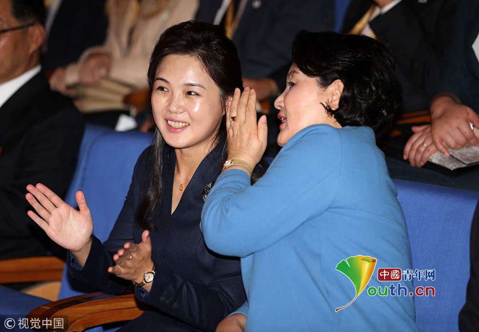 當(dāng)?shù)貢r(shí)間2018年9月18日,朝鮮平壤,韓國總統(tǒng)文在寅夫人金正淑在朝鮮國務(wù)委員會委員長金正恩夫人李雪主的陪同下參觀平壤金元均音樂大學(xué)。圖片作者:視覺中國