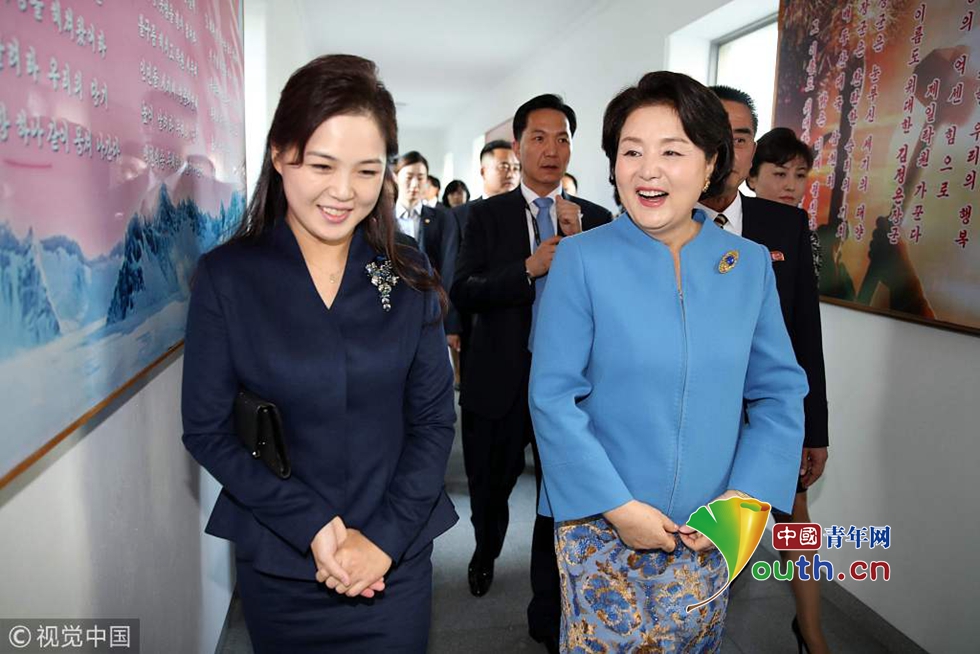 當(dāng)?shù)貢r(shí)間2018年9月18日,朝鮮平壤,韓國總統(tǒng)文在寅夫人金正淑在朝鮮國務(wù)委員會委員長金正恩夫人李雪主的陪同下參觀平壤金元均音樂大學(xué)。圖片作者:視覺中國