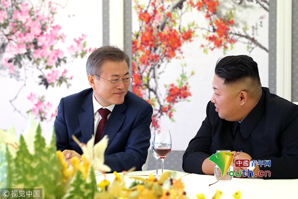 當?shù)貢r間2018年9月20日,朝鮮,韓國總統(tǒng)文在寅在三池淵招待所和金正恩夫婦一起共進午餐。圖片作者:Yonhap News Agency/視覺中國