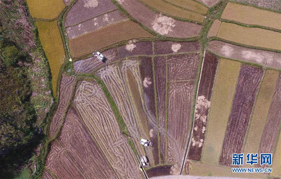9月20日,廣南縣八寶鎮(zhèn)壩龍村的農(nóng)民在用收割機收稻谷(無人機拍攝)。 云南省文山壯族苗族自治州廣南縣八寶鎮(zhèn)今年種植優(yōu)質(zhì)水稻22000余畝,秋收季節(jié),田野里一片金黃,景色如畫。 新華社記者楊宗友攝