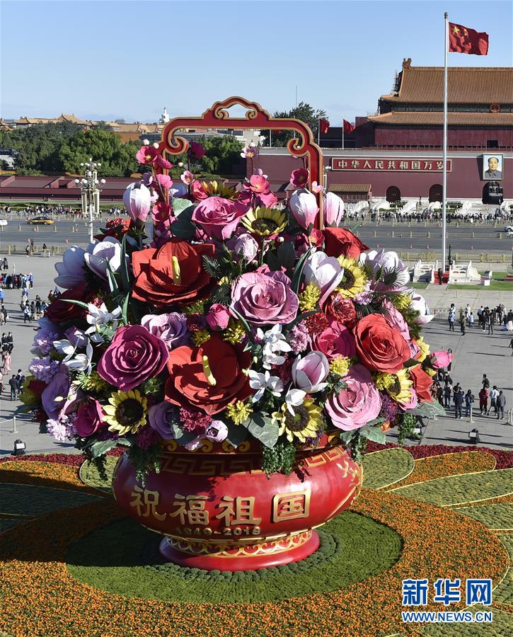當日,“祝福祖國”巨型花籃在北京天安門廣場全面亮相。據(jù)了解,從2011年開始,“祝福祖國”巨型花籃一直作為天安門廣場中心花壇的主景在國慶節(jié)期間向祖國獻禮。今年花籃內(nèi)布置有紅掌、梅花、康乃馨、向日葵、蘭花、月季等多種仿真花卉,寓意幸福吉祥。 新華社記者 李賀 攝