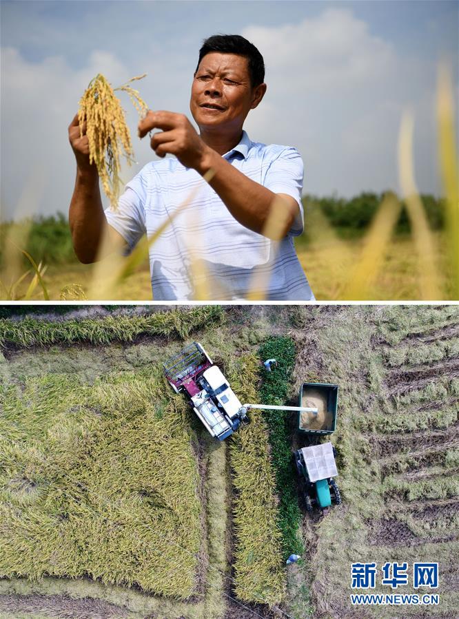 這張拼版照片顯示的是:上圖,9月12日,安徽省肥西縣山南鎮(zhèn)小井莊村種糧大戶陳良玉在查看水稻稻粒;下圖,9月12日,陳良玉和農(nóng)機手駕駛機械在稻田里忙碌(無人機拍攝)。 新華社記者劉軍喜攝
