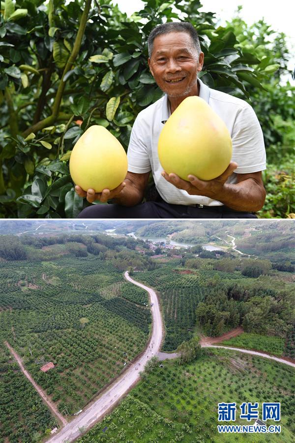 這張拼版照片顯示的是:上圖,9月18日,廣西武宣縣東鄉(xiāng)鎮(zhèn)風(fēng)沿村村民陳紹桂展示剛采摘的蜜柚;下圖,9月18日,人們在風(fēng)沿村三紅蜜柚種植基地內(nèi)行走(無人機拍攝)。 新華社記者陸波岸攝