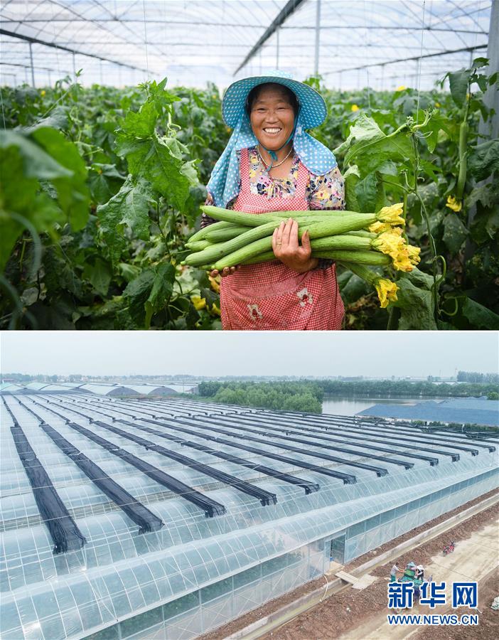 這張拼版照片顯示的是:上圖,9月21日,在江蘇省響水縣九豐現(xiàn)代高效農(nóng)業(yè)示范園的大棚內(nèi),56歲的農(nóng)民徐曉菊展示收獲的絲瓜;下圖,9月21日,徐曉菊(中)和村民一起搬運收獲的絲瓜(無人機拍攝)。 新華社記者季春鵬攝