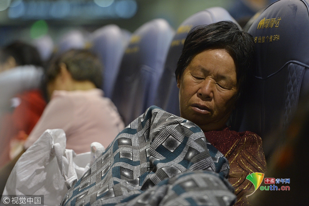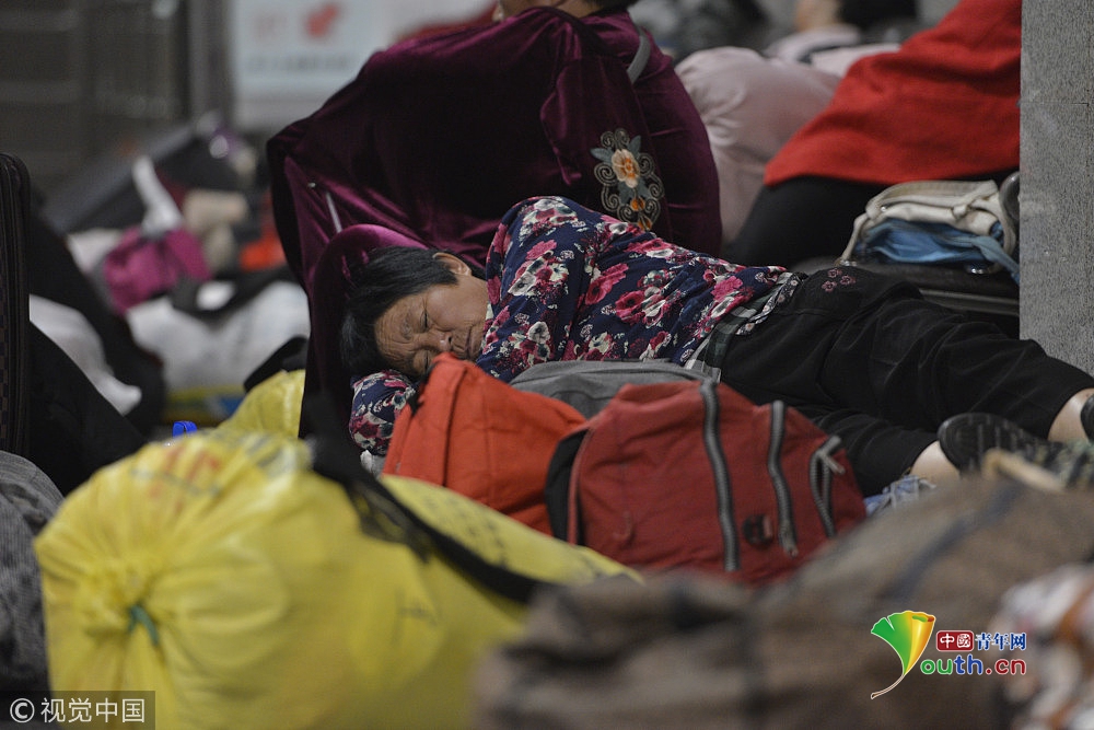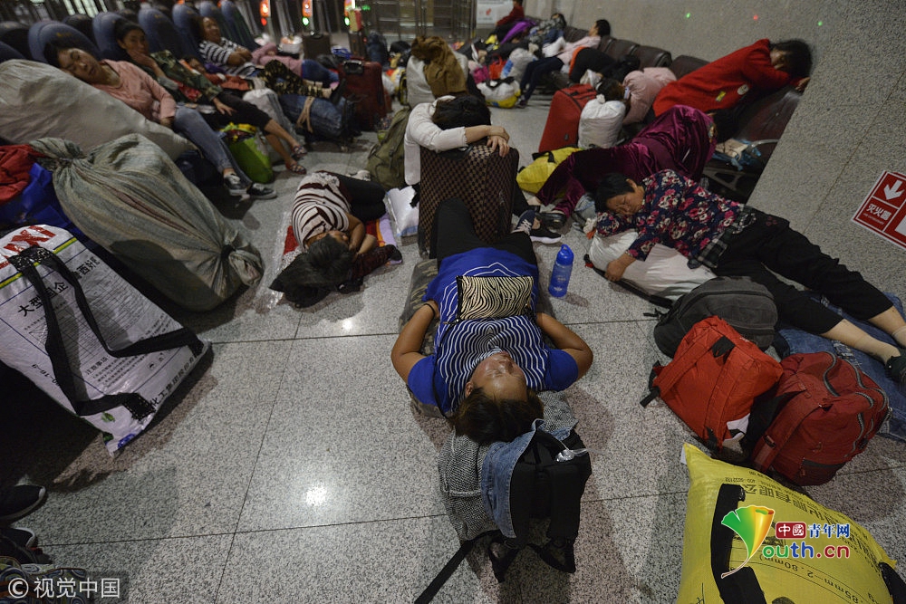 2018年9月15日,在鄭州火車站候車大廳,來(lái)自周口西華縣農(nóng)村的數(shù)百名采棉工,為趕早上4點(diǎn)50分的火車,在火車室打地鋪休息。
