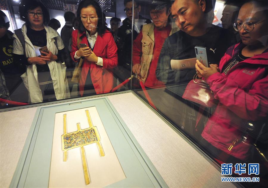 9月24日,在位于烏魯木齊的新疆博物館,參觀者在“尼雅·考古·故事——中日尼雅考古30周年成果展”上觀看“五星出東方利中國”錦護(hù)臂。此次展覽從9月22日持續(xù)到2019年1月。新華社記者 王菲 攝
