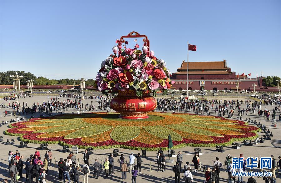 9月23日在北京天安門廣場拍攝的“祝福祖國” 巨型花籃。新華社 李賀 攝