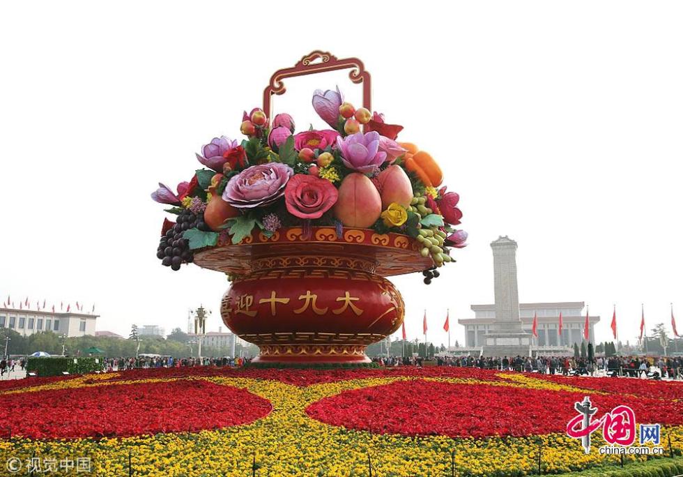 2017年天安門廣場(chǎng)大花籃以喜慶的花果籃為主景,花籃頂高17米,籃體高15.3米,底部直徑達(dá)50米?;@體南側(cè)寫有“祝福祖國(guó)、1949-2017”,北側(cè)寫有“喜迎十九大” 字樣。花果籃內(nèi)共使用主花56朵(牡丹、月季、玉蘭、金桂、迎春花、蘋果花、紫藤花、文心蘭、葉子花),其中最大牡丹直徑3.2米,果實(shí)6種(石榴、桃、柿子、蘋果、海棠、葡萄)。寓意吉祥的果實(shí)和花卉,象征十八大以來(lái),黨和國(guó)家在各個(gè)領(lǐng)域取得的輝煌成就,碩果累累。底部花壇采用心形圖案,寓意紅心向黨,象征著全國(guó)人民緊密團(tuán)結(jié)在以習(xí)近平同志為核心的黨中央周圍,表達(dá)對(duì)祖國(guó)繁榮富強(qiáng)、欣欣向榮的美好祝福。