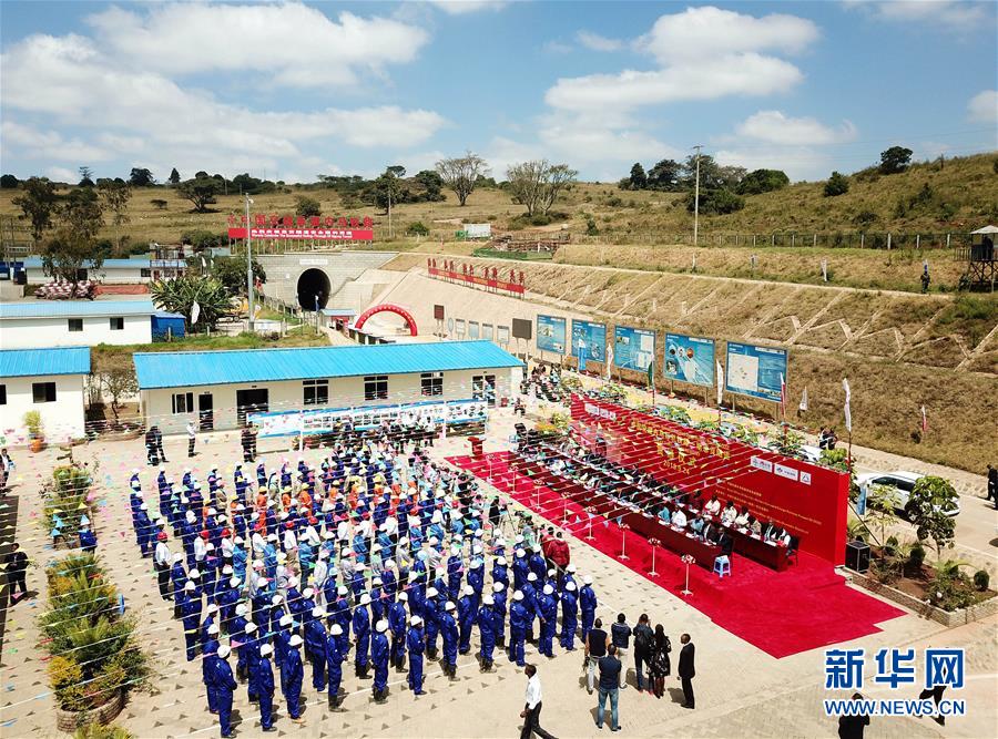 這是9月24日拍攝的內羅畢-馬拉巴標軌鐵路(內馬鐵路)項目第一期恩貢隧道貫通儀式現(xiàn)場(航拍照片)。 由中國交通建設股份有限公司承建的內羅畢-馬拉巴標軌鐵路(內馬鐵路)項目第一期恩貢隧道24日實現(xiàn)貫通。據(jù)悉,恩貢隧道全長約4.5公里,是目前東非地區(qū)最長的鐵路隧道。它的建成標志著內馬鐵路項目第一期取得了突破性進展。 新華社記者王騰攝