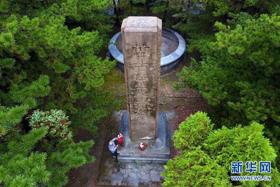 在黃崖洞烈士陵園,趙乃堂將花擺在黃崖洞保衛(wèi)戰(zhàn)殉國烈士紀(jì)念塔前(9月19日無人機拍攝)。 新華社記者 詹彥 攝