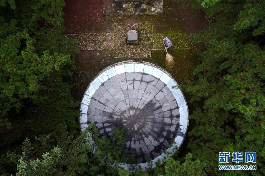 趙乃堂在黃崖洞烈士陵園內(nèi)打掃(9月19日無人機拍攝)。 新華社記者 詹彥 攝