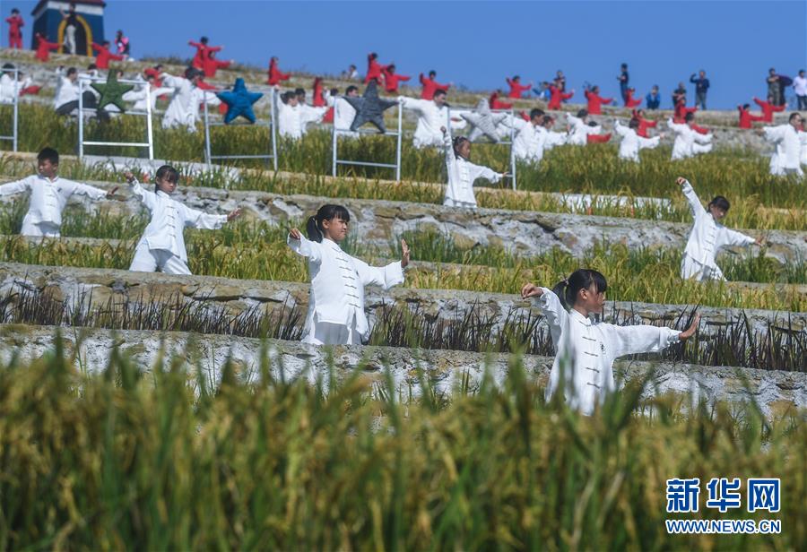 9月29日拍攝的秋日中的建德市大洋鎮(zhèn)高垣村梯田風景。當日,2000多名太極拳愛好者在浙江省建德市大洋鎮(zhèn)高垣村的千畝梯田上參加太極拳表演,吸引很多當?shù)厝撕陀慰颓皝碛^賞,助力當?shù)亟鹎飼r節(jié)鄉(xiāng)村旅游。近兩年來,大洋鎮(zhèn)充分利用土地整治后形成的千畝梯田打造農(nóng)業(yè)觀光綜合體,發(fā)展綜合型農(nóng)業(yè)觀光旅游,為鄉(xiāng)村振興注入新活力。新華社記者徐昱攝