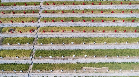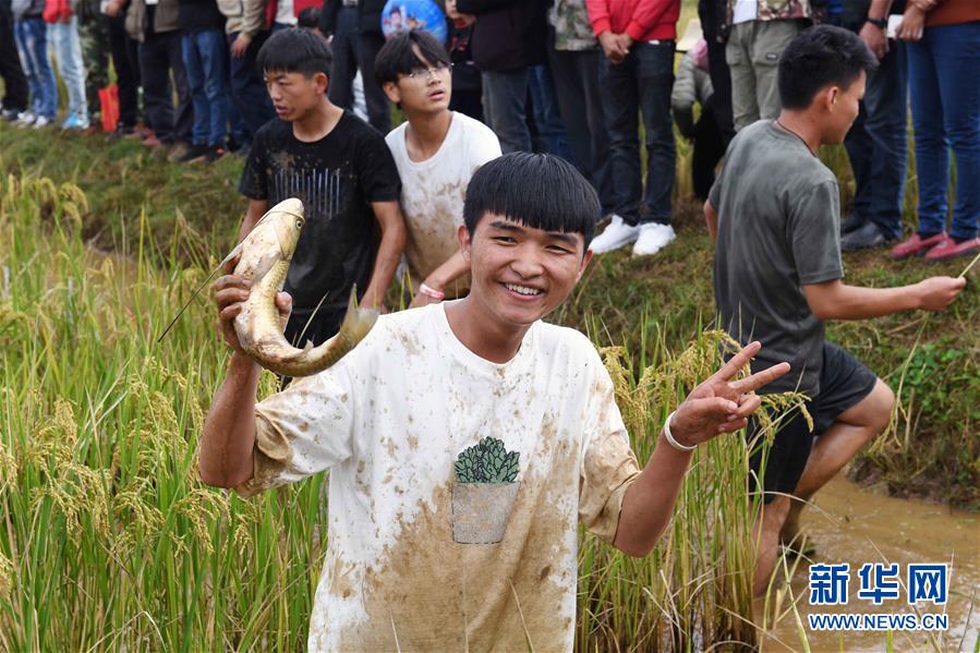 9月29日,一名小伙子展示摸到的魚。9月29日,云南省尋甸回族彝族自治縣2018年首屆農民豐收節(jié)暨第二屆摸魚節(jié)在雞街鎮(zhèn)舉行,當地農民和游客在豐收的稻田里進行摸魚、拔谷穗、山歌對唱等活動,享受收獲的喜悅。新華社記者楊宗友攝