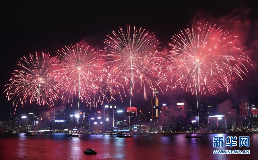 這是10月1日晚拍攝的香港維多利亞港煙花匯演。當晚,香港維多利亞港舉行煙花匯演,慶祝中華人民共和國成立69周年。新華社記者李鋼攝