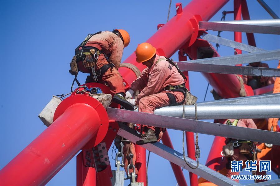 10月1日,工作人員在浙江舟山500千伏聯(lián)網(wǎng)輸變電工程金塘島380米輸電鐵塔上施工。當(dāng)日是國慶節(jié),許多勞動者堅守在工作一線,在崗位上度過節(jié)日。新華社記者徐昱攝