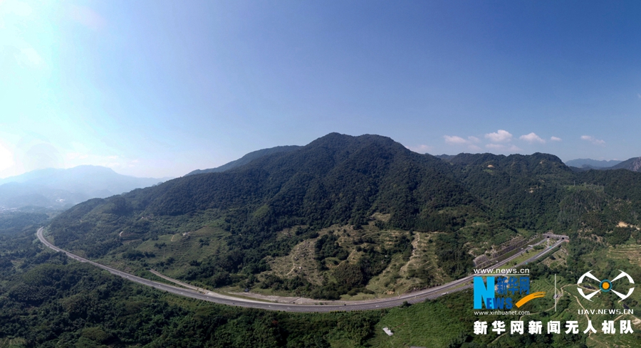 拼接照片:這是廈蓉高速南靖縣建安隧道(右)外的長下坡路段。改擴建工程竣工之后,長下坡將改成上行線,變?yōu)樯掀侣范危o人機拍攝)。新華網(wǎng) 肖和勇 攝