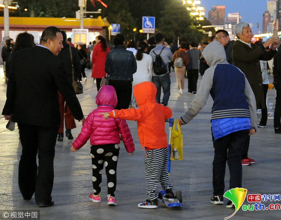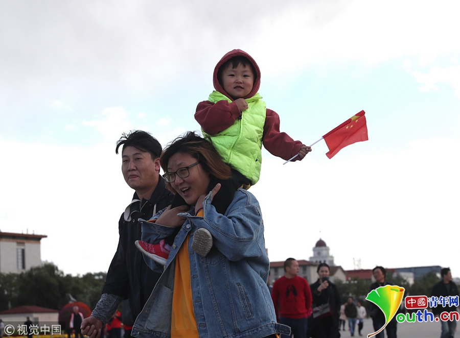中國青年網(wǎng)北京10月10日電 2018年10月9日,北京,游客紛紛著秋冬裝游覽天安門廣場。當天北京冷空氣來襲。圖片來源:視覺中國