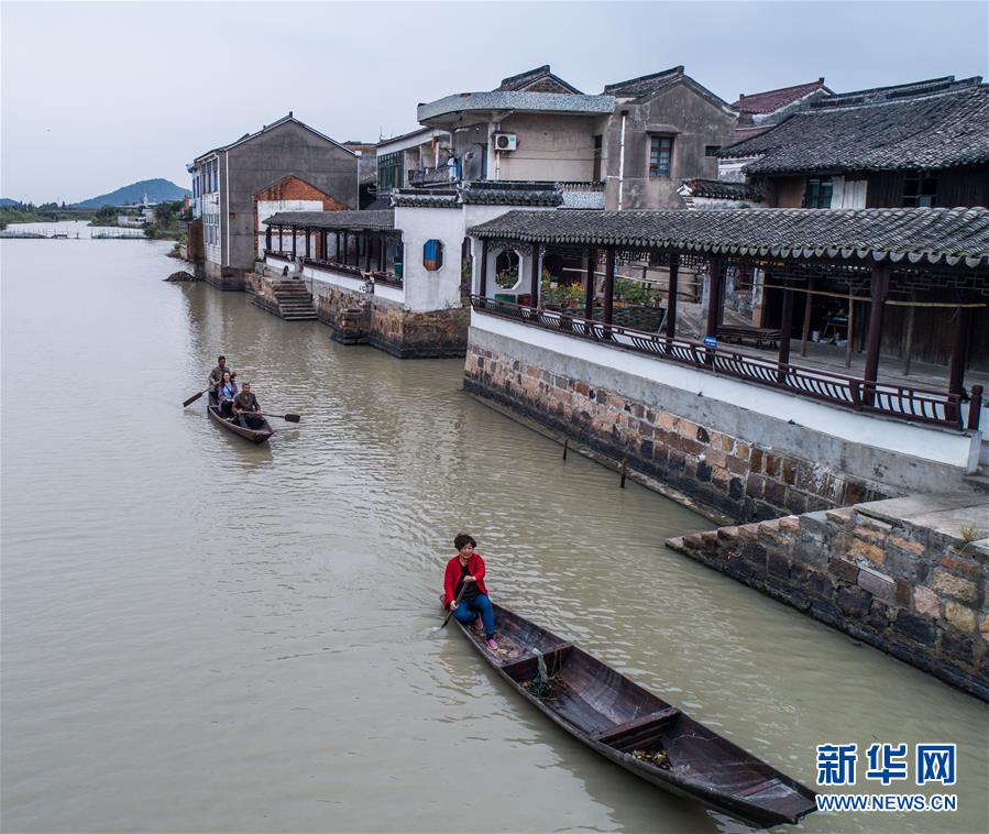 10月10日,泉家潭村村民劃著小船經(jīng)過(guò)沿河長(zhǎng)廊(無(wú)人機(jī)拍攝)。經(jīng)過(guò)改造提升后,沿河長(zhǎng)廊和整潔的古村街巷成為當(dāng)?shù)孛利愢l(xiāng)村的景觀帶。 新華社記者 徐昱