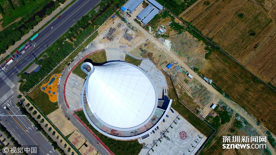 2018年6月13日,航拍河南淮陽(yáng)一座即將竣工落成的體育場(chǎng)館建筑,市民稱酷似一個(gè)石磨盤。