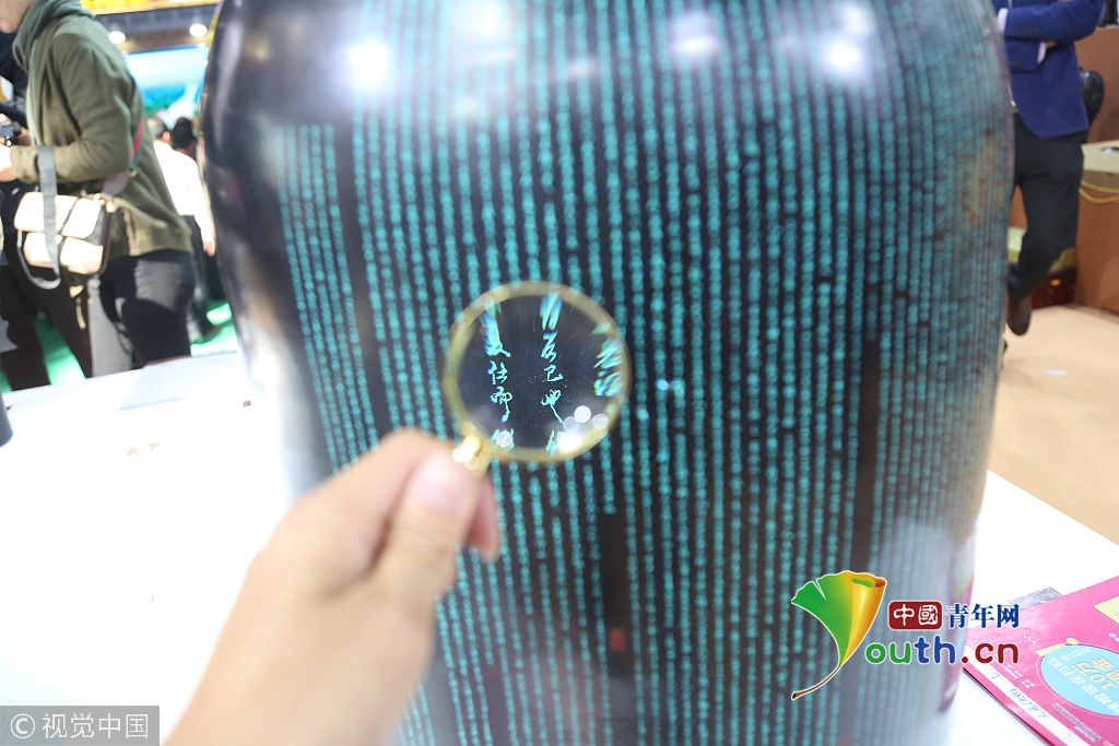2018年10月14日,山東濟(jì)南,高新會展中心濟(jì)南文博會現(xiàn)場,張務(wù)福老先生在黑陶鼎上刻字。