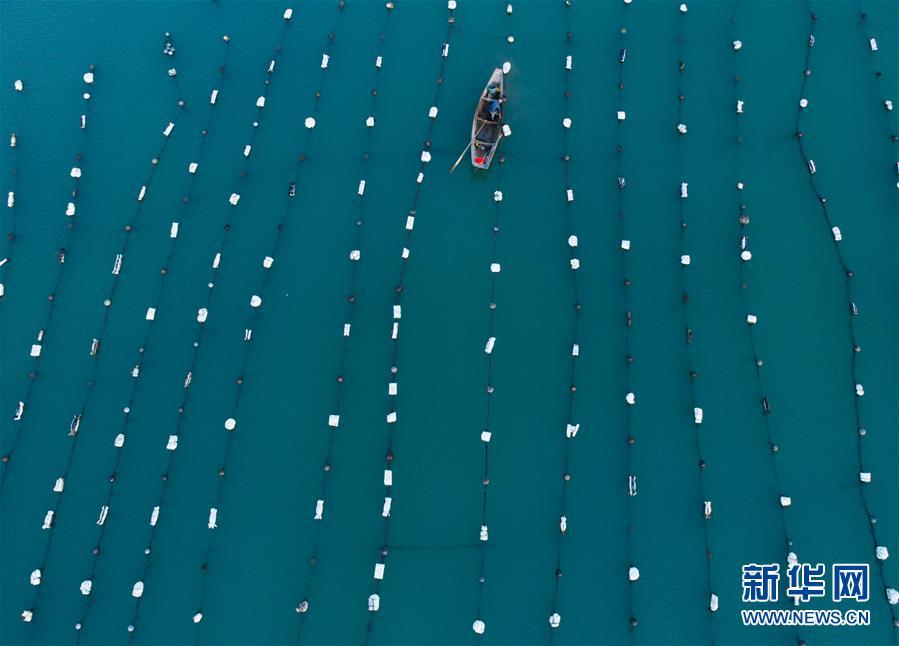 8月18日,南麂島馬祖岙海灣內(nèi),養(yǎng)殖戶乘船在貽貝養(yǎng)殖區(qū)內(nèi)作業(yè)(無人機(jī)拍攝)。進(jìn)入8月,浙江省溫州市平陽縣南麂鎮(zhèn)海域上大片的大黃魚、貽貝等特色海產(chǎn)品養(yǎng)殖區(qū)域迎來豐收季節(jié),養(yǎng)殖戶們駕駛漁船在養(yǎng)殖區(qū)海域進(jìn)行打撈收獲,在碧海藍(lán)天下構(gòu)成了一幅“海上牧場”的美麗豐收景象。近年來,南麂鎮(zhèn)政府引導(dǎo)漁民養(yǎng)殖戶充分發(fā)揮“靠海吃海”的資源優(yōu)勢,大力發(fā)展海洋養(yǎng)殖經(jīng)濟(jì)和海島旅游經(jīng)濟(jì),實(shí)現(xiàn)了南麂由“生態(tài)美”向“產(chǎn)業(yè)美”,“產(chǎn)業(yè)美”向“經(jīng)濟(jì)美”的轉(zhuǎn)變。同時該鎮(zhèn)堅持以大黃魚、貽貝等為特色產(chǎn)業(yè)支撐,精準(zhǔn)發(fā)展高效海洋養(yǎng)殖業(yè),重點(diǎn)培養(yǎng)一批新型職業(yè)漁民,依靠專業(yè)技術(shù)支持,實(shí)現(xiàn)深海仿生養(yǎng)殖,讓好生態(tài)造就好品質(zhì),重點(diǎn)打造南麂養(yǎng)殖品牌,組建營銷網(wǎng)絡(luò),拓展特色海產(chǎn)品市場。新華社記者 徐昱攝