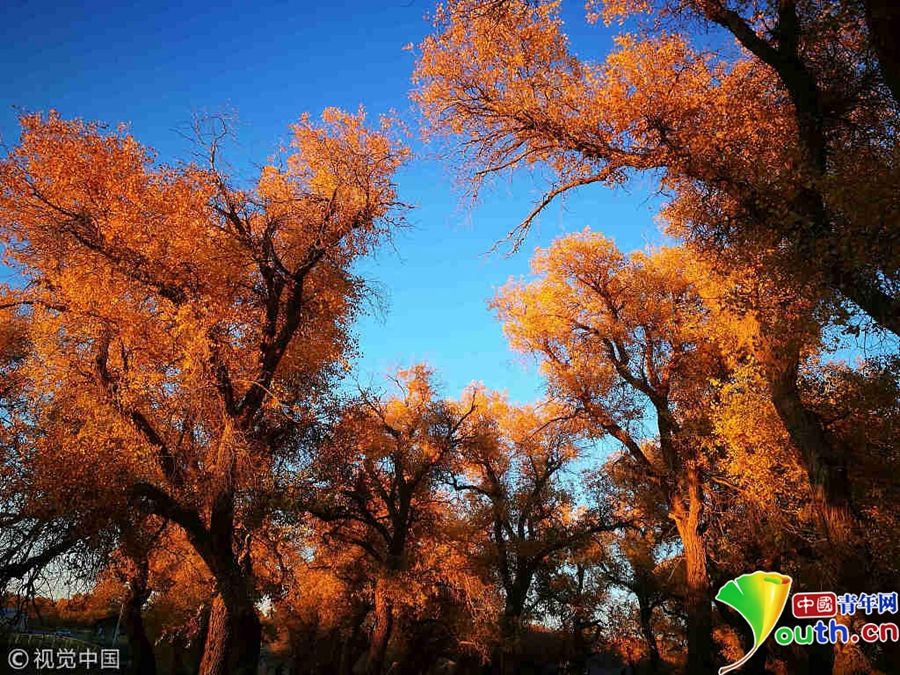 中國青年網(wǎng)北京10月9日電 2018年10月7日至8日,內(nèi)蒙古自治區(qū)阿拉善盟額濟(jì)納旗,地處巴丹吉林沙漠。額濟(jì)納河兩岸壯觀的胡楊林堪稱大漠的一顆綠色明珠,每年深秋時節(jié)的第一場秋霜過后,大片的胡楊樹葉由綠變黃,一眼望去,陽光下金色的樹葉襯著湛藍(lán)的天空于風(fēng)中婆娑起舞,鮮明的影調(diào),亮麗的色彩,令人流連忘返。