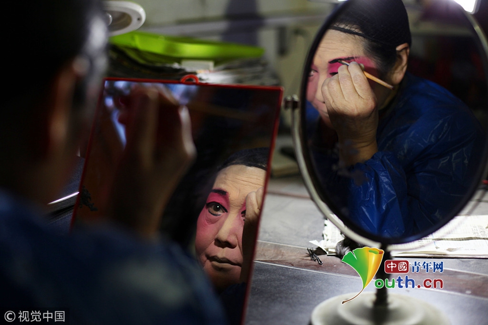 2016年3月10日,陜西安康,今年70歲的劉鳳鳴10歲時(shí)開始學(xué)漢調(diào)二黃,40歲時(shí)從廁所抱回智殘?bào)w殘棄嬰,因?yàn)閷?duì)藝術(shù)的熱愛、對(duì)生命的敬畏她選擇了不離不棄。人生如戲,戲如人生。劉鳳鳴說,像她們這樣的業(yè)余劇團(tuán),沒有專門的化妝師,她要求每個(gè)演員必須學(xué)會(huì)化妝。圖片作者:魏永賢/視覺中國(guó)