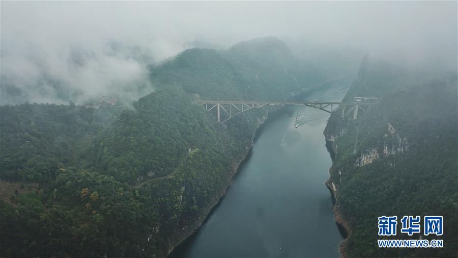 10月18日無(wú)人機(jī)航拍的江界河大橋。 當(dāng)日,位于貴州甕安縣的江界河大橋云霧環(huán)繞,景美如畫(huà)。 新華社記者歐東衢攝
