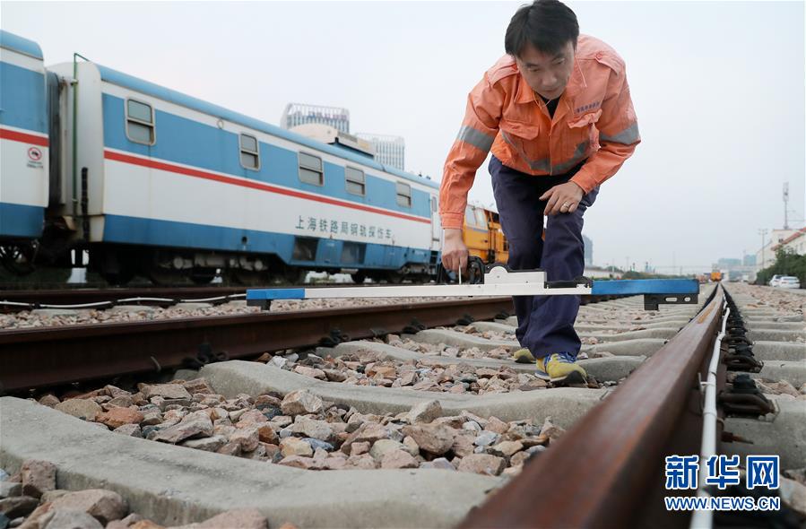 10月17日,李峰在上海何家灣站內(nèi)鐵軌上演示早期使用鋁合金道尺檢測(cè)鋼軌間距的操作。這一操作全憑檢修工人經(jīng)驗(yàn),近四公里的線(xiàn)路檢查,需要工人彎腰上千次。 新華社記者 方喆 攝