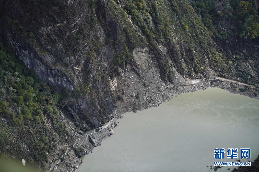 10月20日,西藏雅魯藏布江米林縣堰塞湖自然過(guò)流后,露出損毀的道路。 10月19日13時(shí)30分,西藏雅魯藏布江米林縣堰塞湖開(kāi)始自然過(guò)流。記者從應(yīng)急管理部牽頭的聯(lián)合工作組獲悉,截至20日7時(shí),雅魯藏布江堰塞湖壩前水位已下降56米,估算留存水量1.6億立方米,堰塞湖洪水威脅得到緩解,防洪安全風(fēng)險(xiǎn)大大減輕,并將繼續(xù)降低。 10月20日,記者乘坐直升機(jī)從空中拍攝了雅魯藏布江堰塞湖自然過(guò)流的畫(huà)面。 新華社記者普布扎西攝