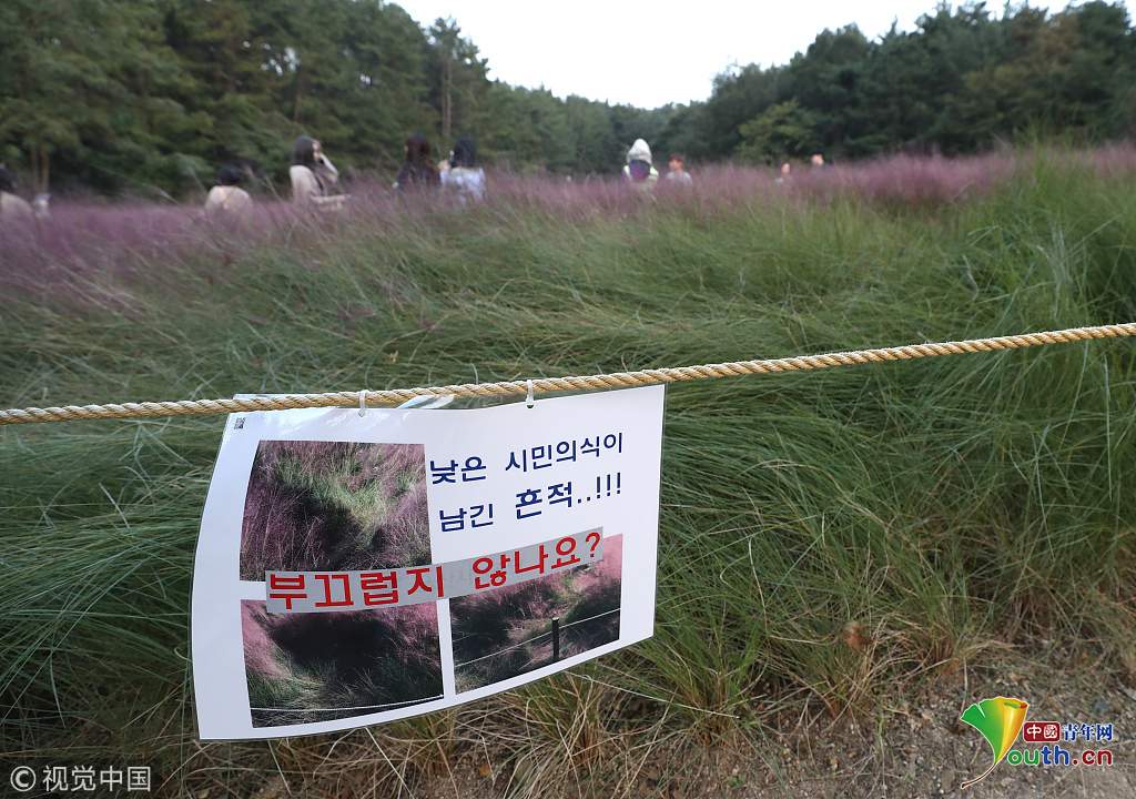 韓國蔚山,近日,蔚山公園大片粉黛亂子草盛開,但部分花海遭游客隨意踩踏。公園并沒有修復遭破壞區(qū)域,而是用繩索圍起并掛上批判性告示,呼吁游客腳下留情。圖片作者:Yonhap News Agency