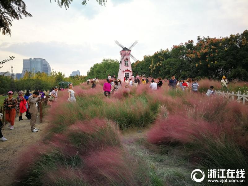 游客在生態(tài)樂園粉黛亂子草中的風車。