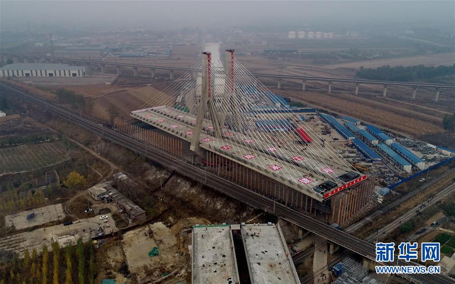 10月25日,唐山市二環(huán)路項目上跨津山鐵路斜拉橋在轉(zhuǎn)體中(無人機(jī)拍攝)。 當(dāng)日,河北省唐山市二環(huán)路項目上跨津山鐵路斜拉橋轉(zhuǎn)體成功。據(jù)介紹,該橋總長927.5米,主橋由斜拉轉(zhuǎn)體橋和轉(zhuǎn)體T構(gòu)橋組成,轉(zhuǎn)體總重5.1萬噸,其中斜拉轉(zhuǎn)體橋重3.3萬噸,主塔高達(dá)80.5米,為曲線變截面“雙人字”形空心塔,自上而下共有128根斜拉索。 新華社記者楊世堯攝
