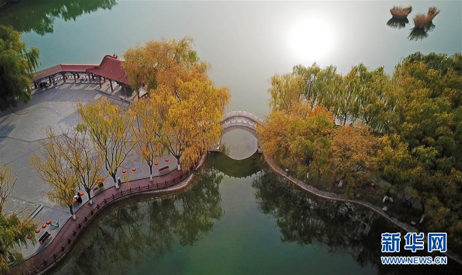 寧夏銀川市鳳凰公園秋景(10月20日無人機拍攝)。