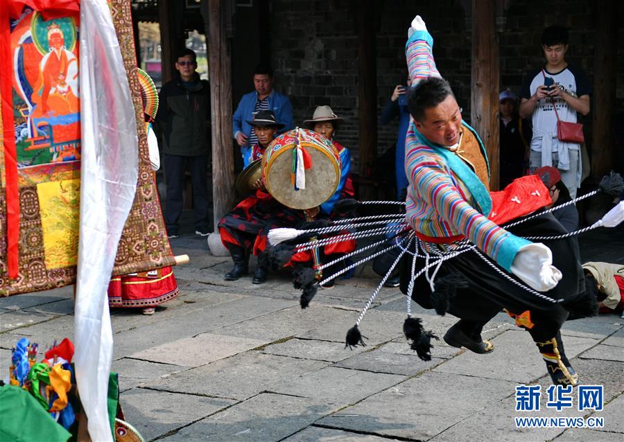 頭戴“藍(lán)”面具、身著五彩裝……附耳在一鼓一鈸中,且看這18名雪域農(nóng)牧民,在這江南水鄉(xiāng)的柔情中吟唱而舞。10月23日至28日,浙江烏鎮(zhèn)西柵景區(qū)的安渡坊碼頭廣場上,珠峰藏戲《頓月頓珠》吸引眾多游客駐足。參與演出的迥巴藏戲隊(duì)來自西藏日喀則市昂仁縣,人們在領(lǐng)略到藏戲風(fēng)采的同時,也感受到了雪域農(nóng)牧民的純樸熱情。 藏戲是戴著面具、輔以唱舞敘事的藏族戲劇。內(nèi)容取材自民間故事、歷史傳說等,距今已有600多年歷史,被譽(yù)為“西藏文化的活化石”。2006年被列入國家級非物質(zhì)文化遺產(chǎn),2009年被聯(lián)合國教科文組織認(rèn)定為世界級非物質(zhì)文化遺產(chǎn)。