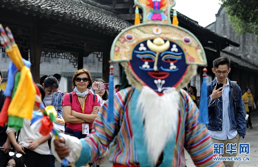 在浙江烏鎮(zhèn)西柵景區(qū)的安渡坊碼頭廣場(chǎng)上,觀眾觀看西藏迥巴藏戲隊(duì)的表演(10月24日攝)。新華社記者 張汝鋒 攝
