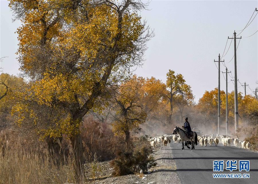 在新疆尉犁縣喀爾曲尕鄉(xiāng),牧羊人馬木提·買買提在胡楊邊上的道路上牧羊(10月25日攝)。 10月中下旬,靜靜的塔里木河中下游一片金黃。胡楊深處,條條小路蜿蜒綿長(zhǎng)通向遠(yuǎn)方,引人入勝。 塔里木河是中國最長(zhǎng)的內(nèi)陸河,這一區(qū)域原始胡楊林分布較為集中。隨著塔里木河連續(xù)19次向下游生態(tài)輸水,為胡楊林“解渴”,塔河兩岸生態(tài)得到明顯改善,沙地面積逐年減少。 新華社記者趙戈攝