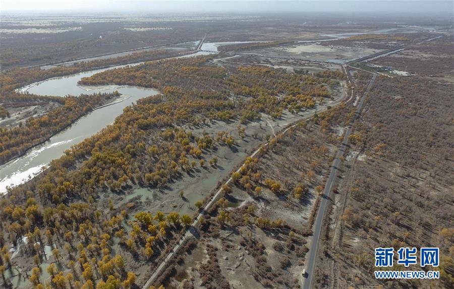從空中俯瞰新疆尉犁縣喀爾曲尕鄉(xiāng),兩條道路沿著塔里木河岸邊的金色胡楊向前延伸(10月25日無人機(jī)拍攝)。 10月中下旬,靜靜的塔里木河中下游一片金黃。胡楊深處,條條小路蜿蜒綿長(zhǎng)通向遠(yuǎn)方,引人入勝。 塔里木河是中國最長(zhǎng)的內(nèi)陸河,這一區(qū)域原始胡楊林分布較為集中。隨著塔里木河連續(xù)19次向下游生態(tài)輸水,為胡楊林“解渴”,塔河兩岸生態(tài)得到明顯改善,沙地面積逐年減少。 新華社記者趙戈攝