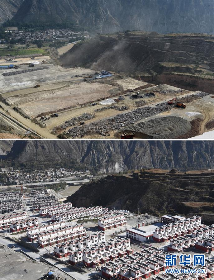 這是一張拼版照片。上圖為:隴南市武都區(qū)坪埡藏族鄉(xiāng)易地扶貧搬遷項(xiàng)目建設(shè)現(xiàn)場(chǎng)(2016年9月1日攝);下圖為:同一角度拍攝的隴南市武都區(qū)坪埡藏族鄉(xiāng)易地扶貧搬遷項(xiàng)目現(xiàn)場(chǎng)(10月31日攝)。新華社記者 范培珅攝