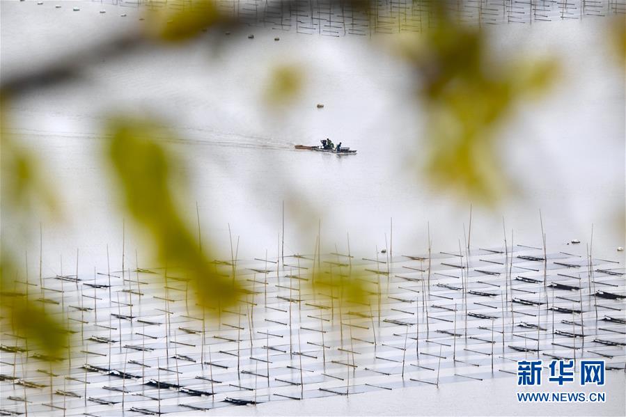 11月4日,漁民在霞浦縣三沙鎮(zhèn)的紫菜種植區(qū)收獲紫菜。 近日,福建省霞浦縣沿海6萬畝紫菜迎來收獲季節(jié),漁民們出海收獲紫菜,海上田園一派繁忙豐收景象。 新華社記者 姜克紅 攝
