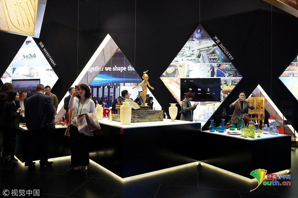2018年11月6日,上海,首屆中國(guó)國(guó)際進(jìn)口博覽會(huì)國(guó)家展上,共有82個(gè)國(guó)家、3個(gè)國(guó)際組織設(shè)立了71個(gè)展臺(tái)。埃及館。視覺(jué)中國(guó)