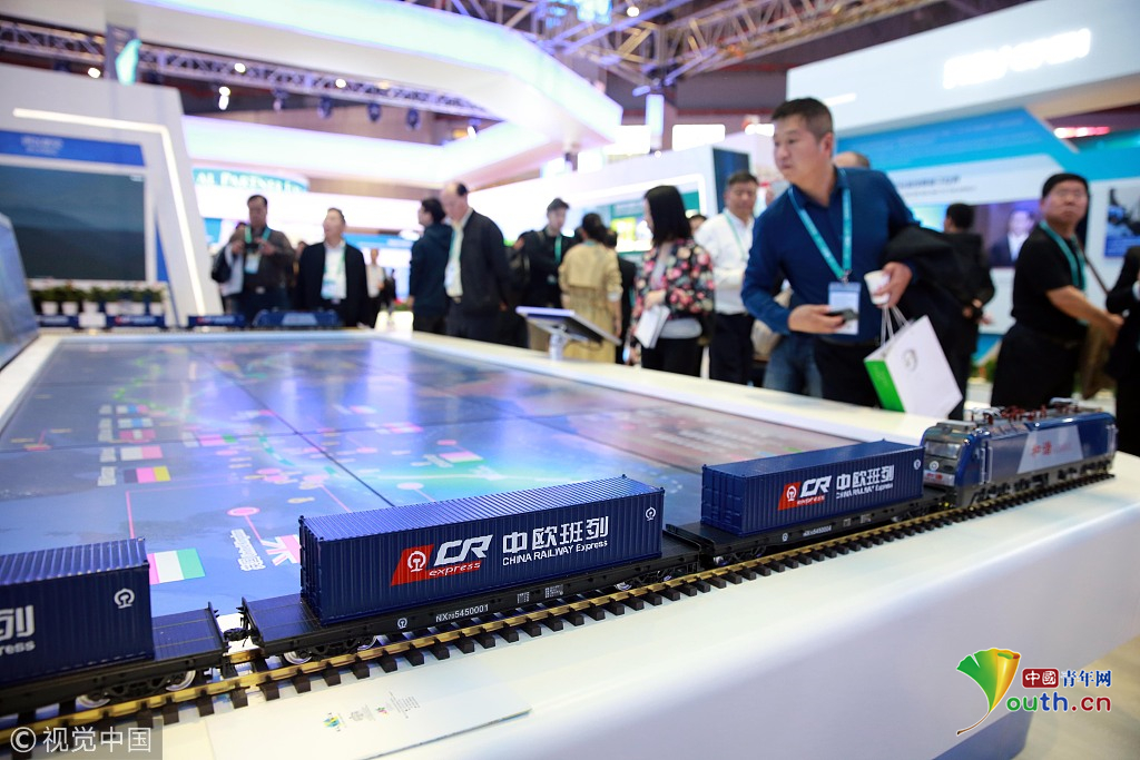 2018年11月6日,上海,首屆中國(guó)國(guó)際進(jìn)口博覽會(huì)國(guó)家展上,共有82個(gè)國(guó)家、3個(gè)國(guó)際組織設(shè)立了71個(gè)展臺(tái)。中國(guó)館展示的中歐班列。視覺(jué)中國(guó)