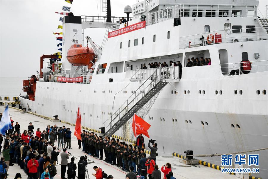 11月7日,科考隊(duì)員在“大洋一號(hào)”上向前來(lái)迎接的人群揮手致意。 新華社記者 李紫恒 攝