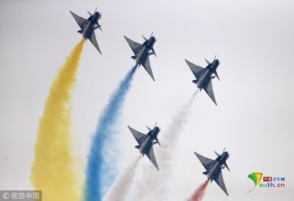 2018年11月8日,廣東珠海,第十二屆中國(guó)國(guó)際航展第三天。空軍“八一”飛行表演隊(duì)的隊(duì)員們,發(fā)揚(yáng)連續(xù)作戰(zhàn)精神,給觀眾們表演了七機(jī)分組開花、四機(jī)編隊(duì)橫滾等高難動(dòng)作,受到觀眾們的稱贊。視覺中國(guó)