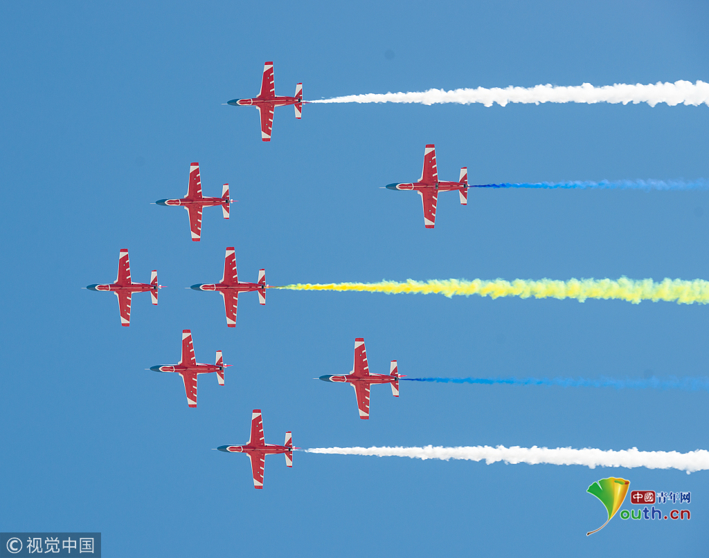 2018年11月7日,廣東珠海,第12屆珠海航展在金灣機(jī)場如火如荼進(jìn)行??哲姾娇沾髮W(xué)“紅鷹”飛行表演隊在第十二屆中國航展進(jìn)行了飛行表演,展示了飛行員精湛的飛行技能。視覺中國